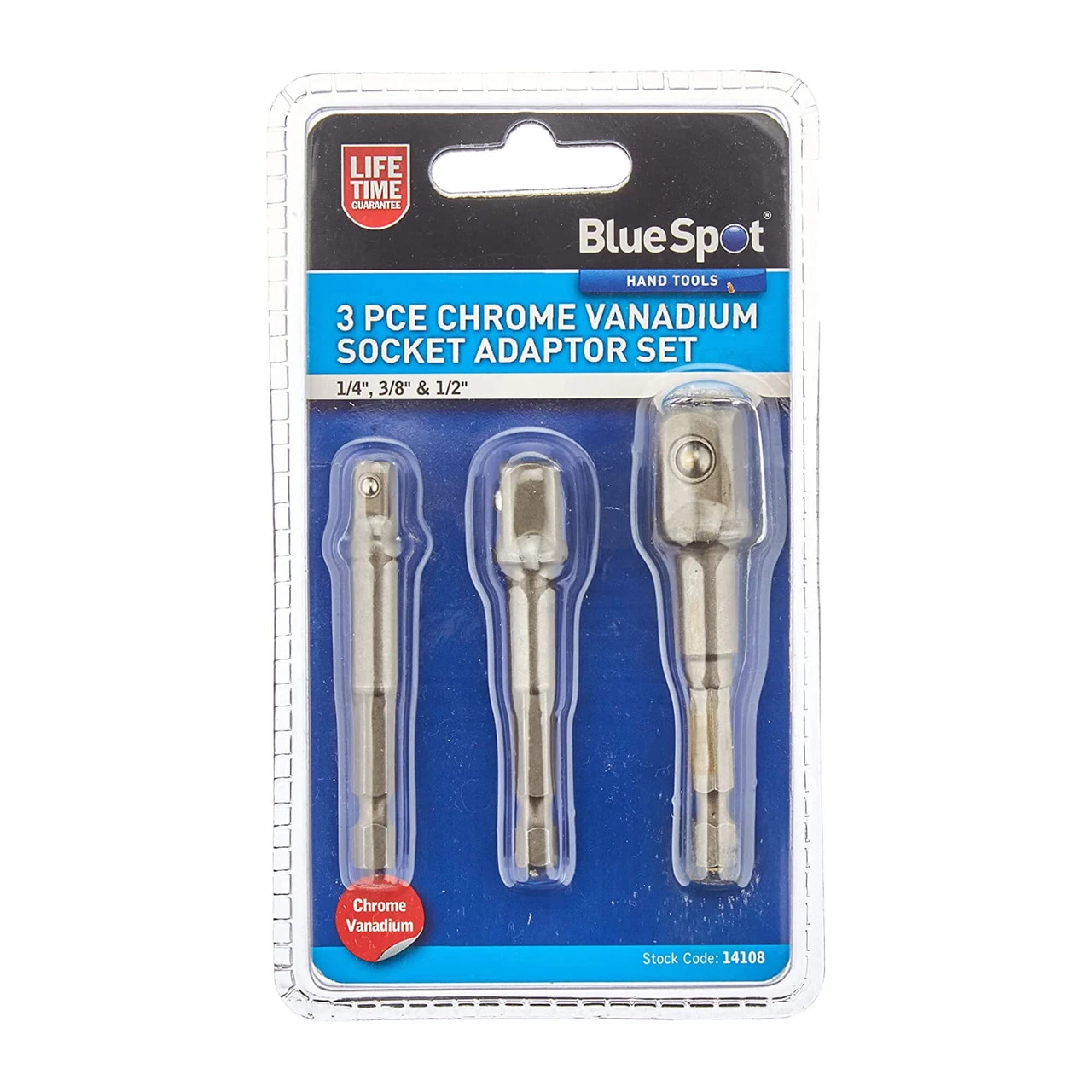 The Blue Spot 3pc chrome vanadium socket adaptor set is manufactured from heavy-duty chrome vanadium steel designed to provide strong and robust durability. These adaptors feature a ball bearing to provide a solid and secure hold.