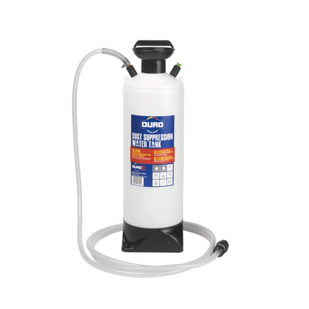 DURO 13L Dust suppression Tank is perfect to use when suppressing dust which has been created by the use of a handheld saw. This Tank has the ability to fit directly onto most saws on the market making it perfect to use in many different working environments. This product will come complete with a 4-metre length of hose, internal water feed and pressure release valve. The tank itself has been manufactured using high-density polyethene.