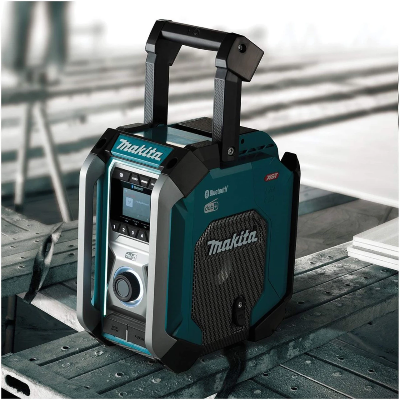 The radio can receive DAB/DAB+ radio stations and is equipped with Bluetooth class 2 to wirelessly connect your mobile device for playing music with a range up to 10m. It features a dual power source, allowing it to be powered by either AC or Makita batteries. The radio is designed with elastomer bumpers to protect against rough handling on a job site, and an AUX-IN jack for connecting to external audio sources. Additionally, it has an AC adaptor jack and a USB output port that allows for charging mobile devices, although it only has the capacity to output and cannot play music files stored on a USB stick. The radio is constructed with IP65 rated dust and shower-proof materials and is compatible with XGT, LXT, and CXT batteries only.
