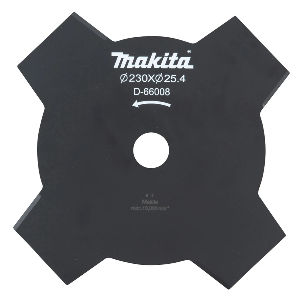 The Makita Star Brush Cutter Blade is a 9” (230mm) diameter Brush Cutter blade designed with 4 teeth, specifically crafted for efficiently cutting through thick grass over a wide area. Constructed from durable steel, this blade boasts a thickness of 1.8mm, ensuring robustness and longevity for tackling tough vegetation with ease.