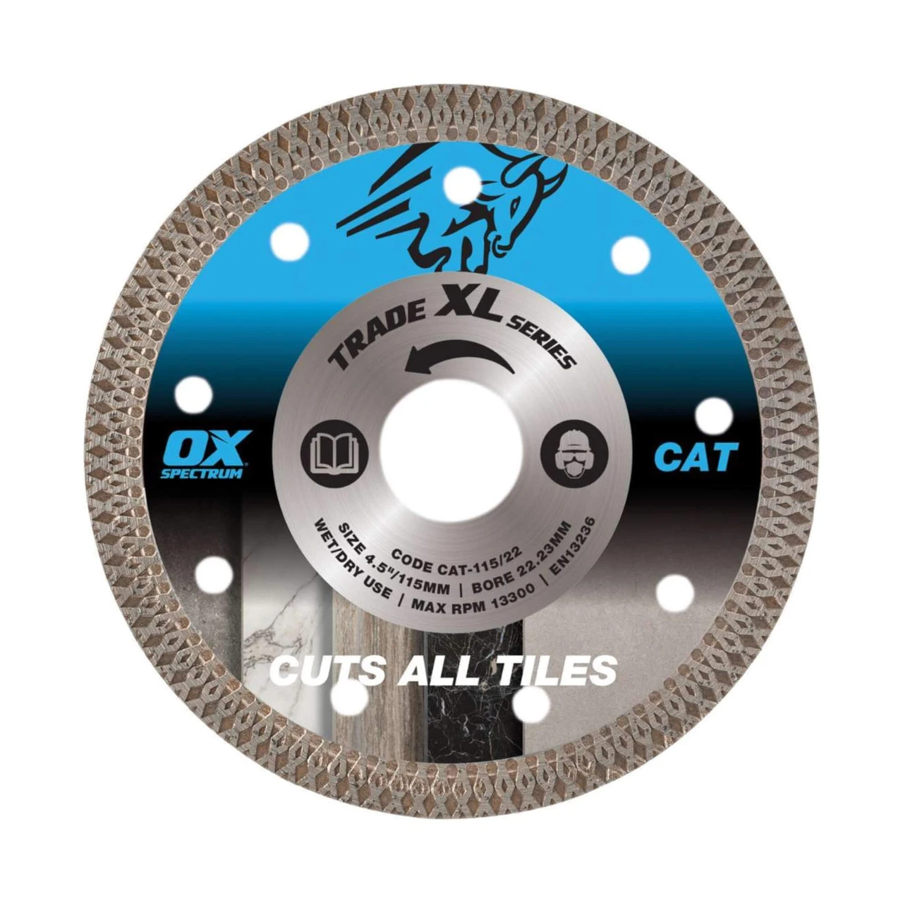 The Ox Tools Trade XL CAT 115mm Tile Cutting Diamond Blade is the perfect cutting blade for professionals, this blade is designed to provide precise accurate cuts with a chip-free finish. This blade is designed for both wet and dry applications and is perfect for cutting through ceramic and medium hard stone tiles.Â