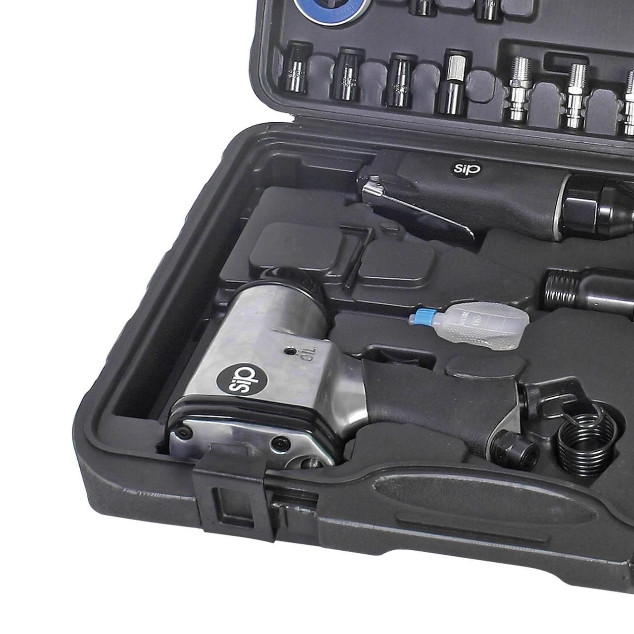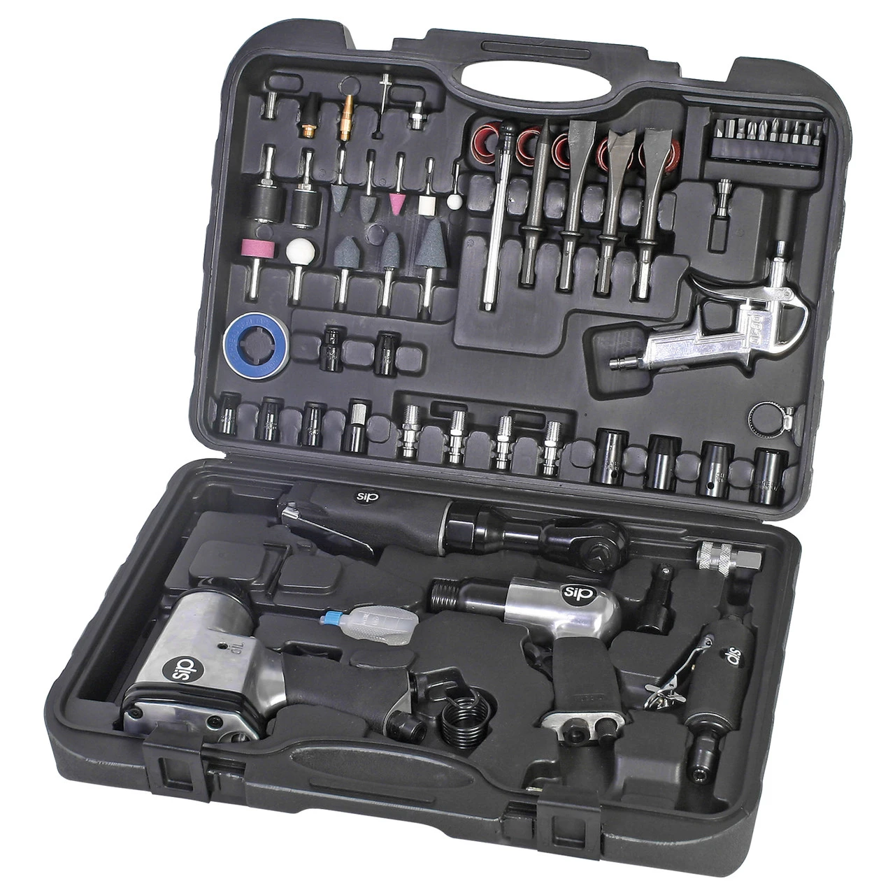 The SIP 73pc Air Tool Kit is a comprehensive kit that features four heavy-duty SIP Air Tools and a range of accessories and consumables that perfectly complement them, ensuring that the user has everything required to get the job done in a range of applications in garage or workshop environments.