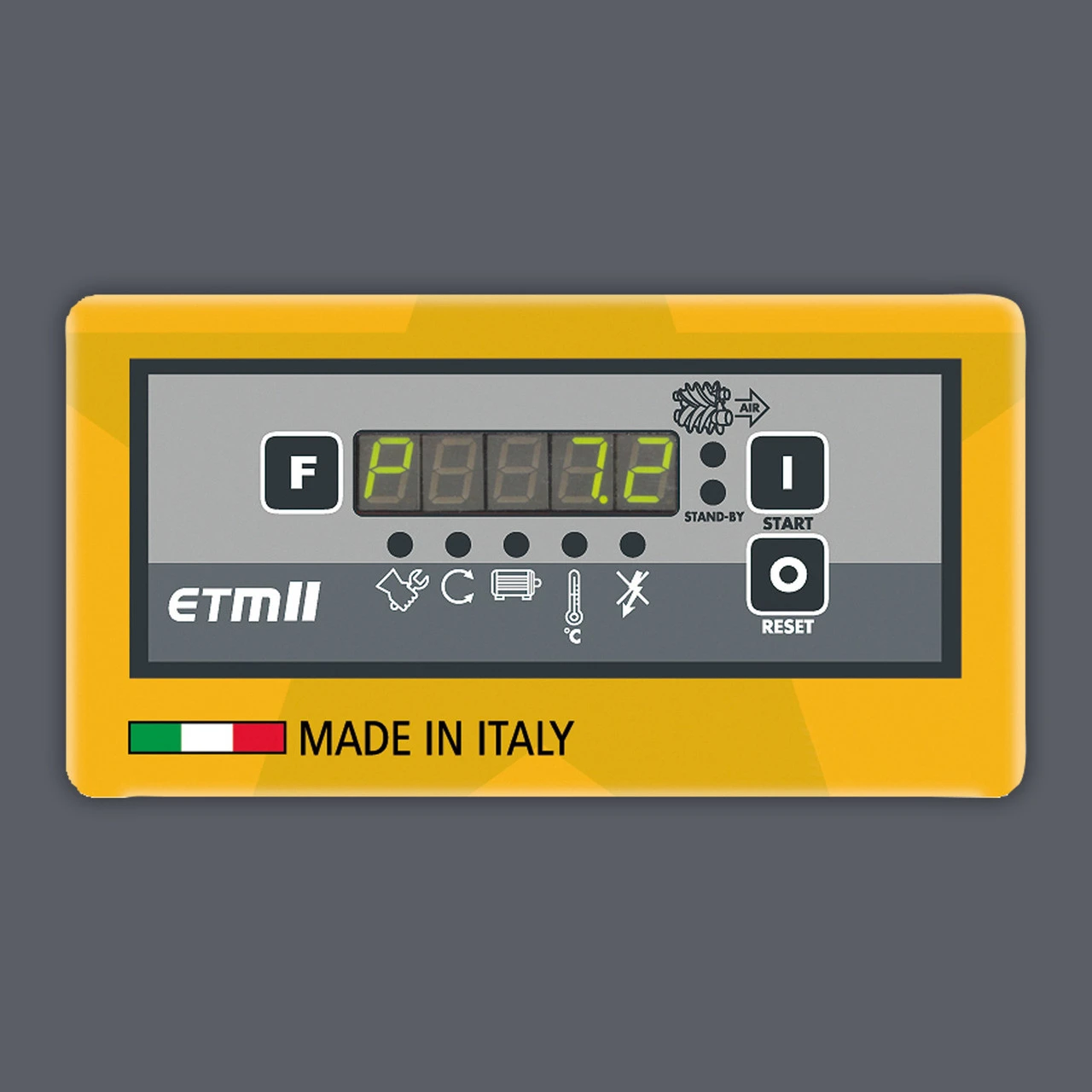 This includes an electronic ETM II controller with digital display, high-quality air end to help deliver constant airflow, and front and rear quick access panels for easy servicing and maintenance. An IE3 premium efficiency motor reduces CO2 emissions.