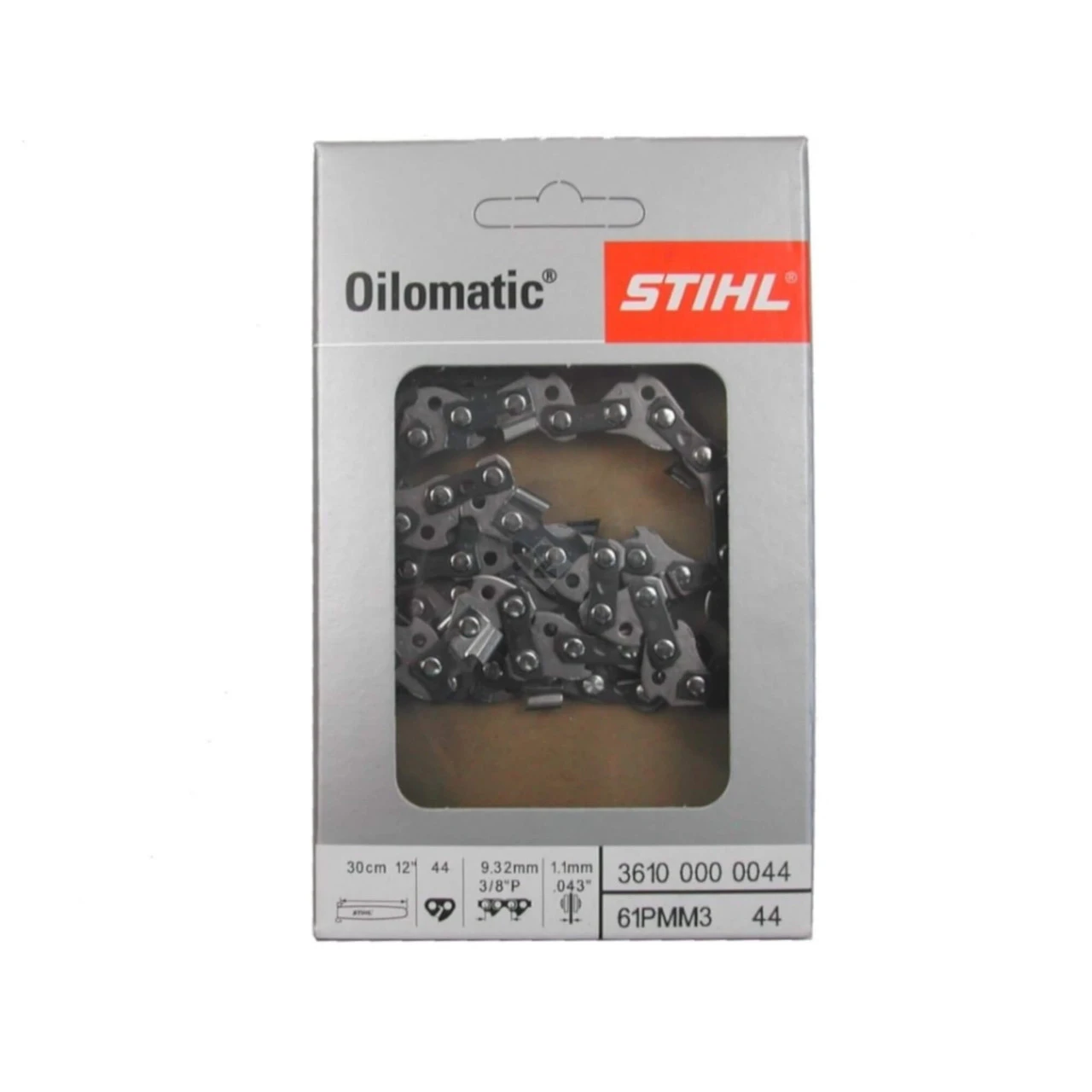 - Stihl Oilomatic lubricating system to reduce friction and wear thanks to fine oil channels in the chain drive links that pick up oil from the bar groove and deliver it quickly and evenly to the chain links and running surfaces of the cutters