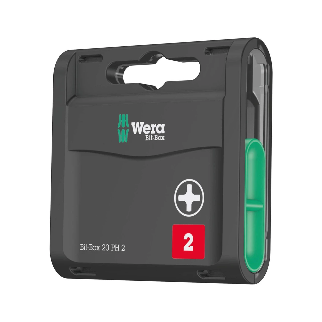 Wera 20pc PH 2 Bit Box is a high-quality bit for Phillips head screws, offering way above average performance throughout the service life. This product has been given enhanced friction resistance thanks to the rough diamond-particle coating on the bit tip which prevents any slipping out of the screw head. Perfect to use with impact drivers.