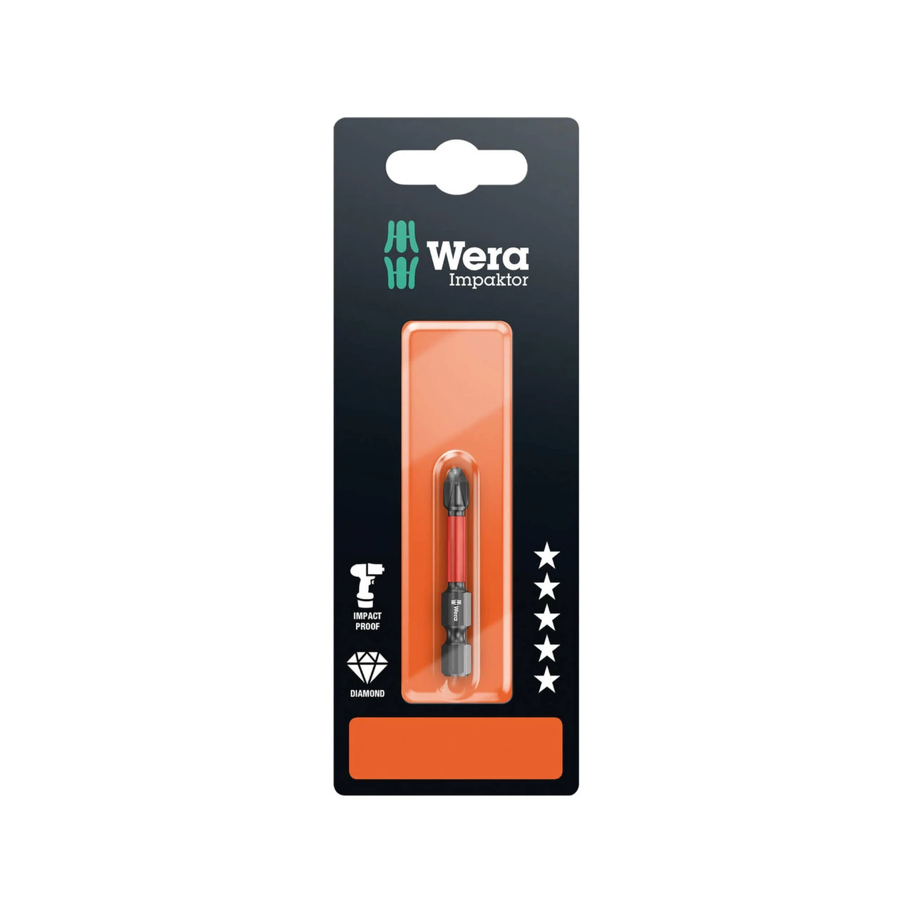 Wera 851/4 Impaktor Bit Phillips PH3 x 50mm Carded is a high-quality bit for Phillips head screws, offering way above average performance throughout the service life. This product has been given enhanced friction resistance thanks to the rough diamond-particle coating on the bit tip which prevents any slipping out of the screw head. Perfect to use with impact drivers.
