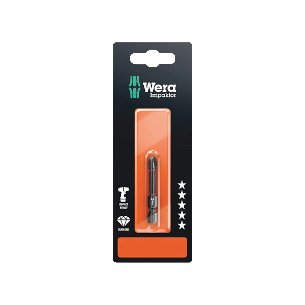 Wera 855/4 Impaktor Bit Pozi PZ2 x 50mm Carded are a high-quality bit for POZI drive screws, offering way above average performance throughout the service life. This product has been given enhanced friction resistance thanks to the rough diamond-particle coating on the bit tip which prevents any slipping out of the screw head. Perfect to use with impact drivers.